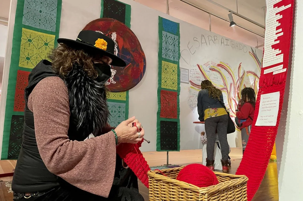 Visitors to this ofrenda in the Mission were invited to knit a few rows to add to a scarf to recall a prominent San Francisco poet and activist Jack Hirschman who wore a signature red scarf.